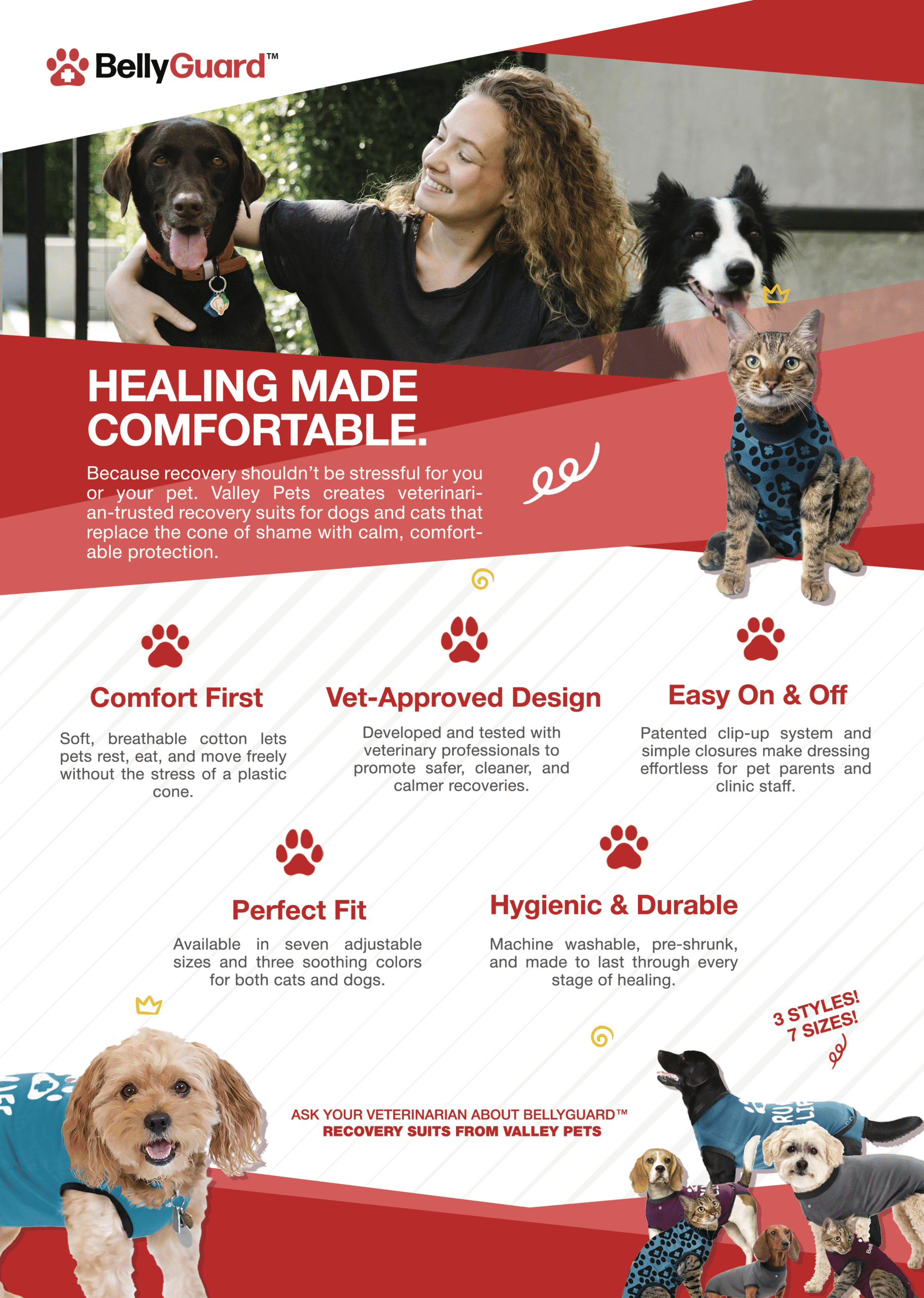 Priced at $12 per unit, and sold in wholesale units of 12 or more, the BellyGuard is the perfect alternative to e-collars in your practice. Clients will appreciate having a cone-of-shame alternative that makes their life and their pet’s life easier.